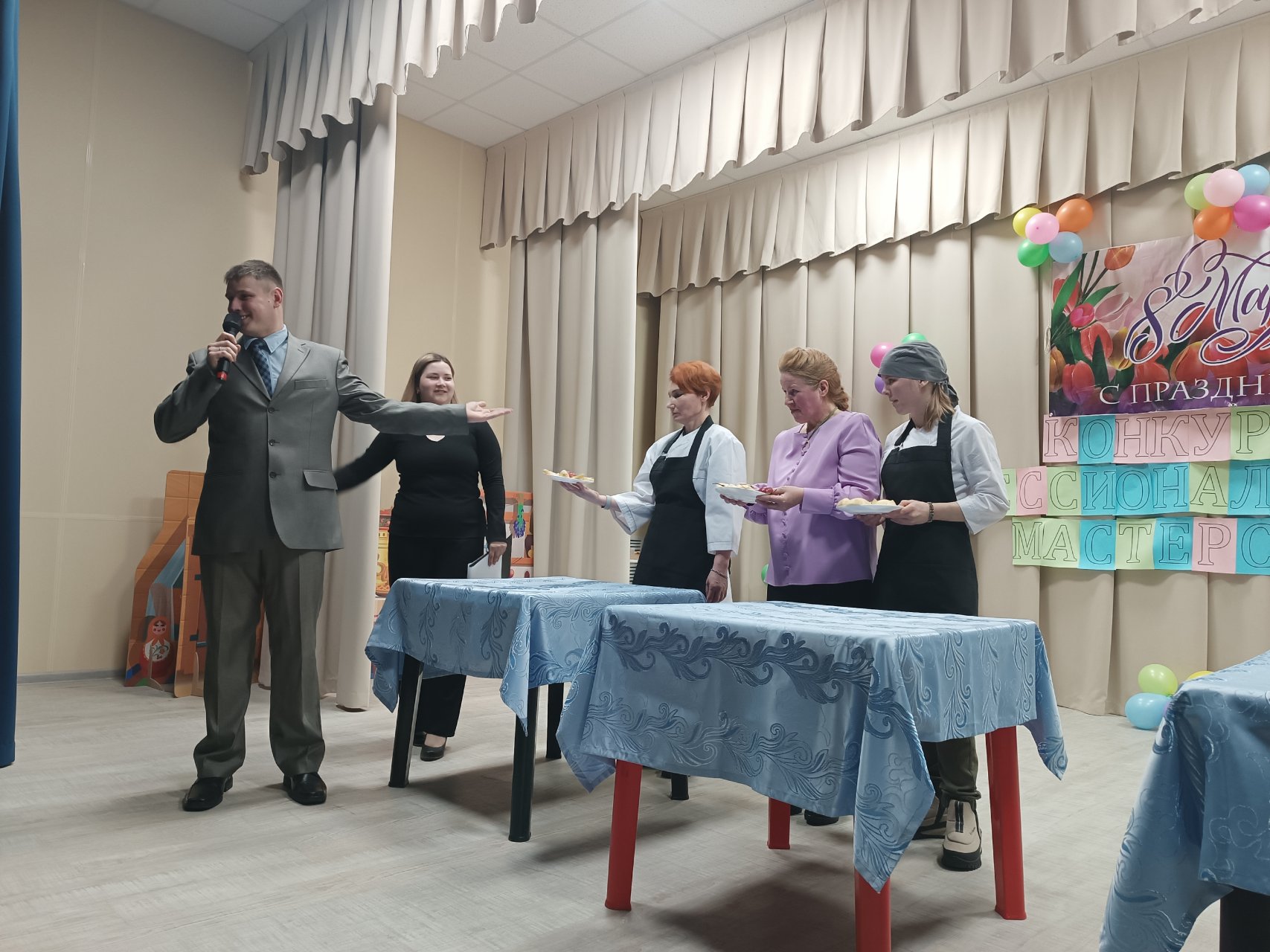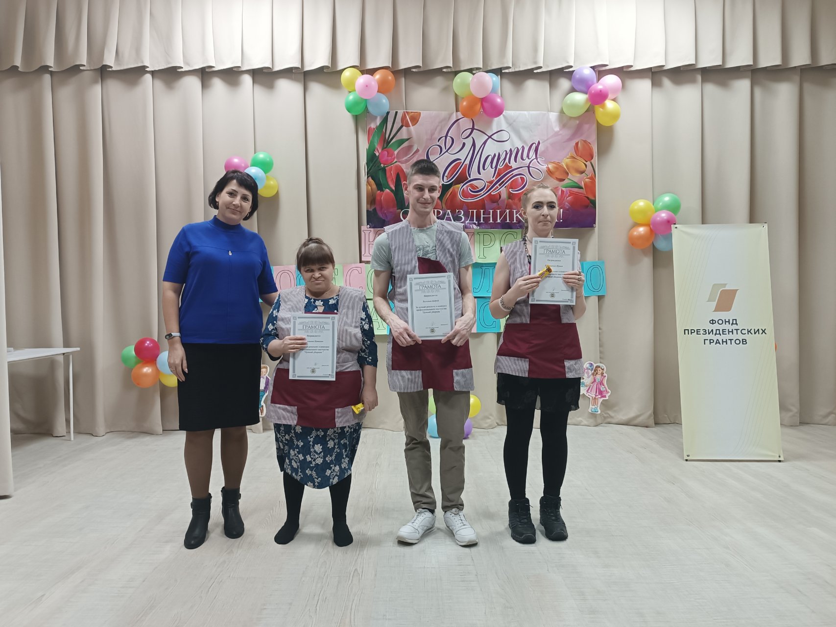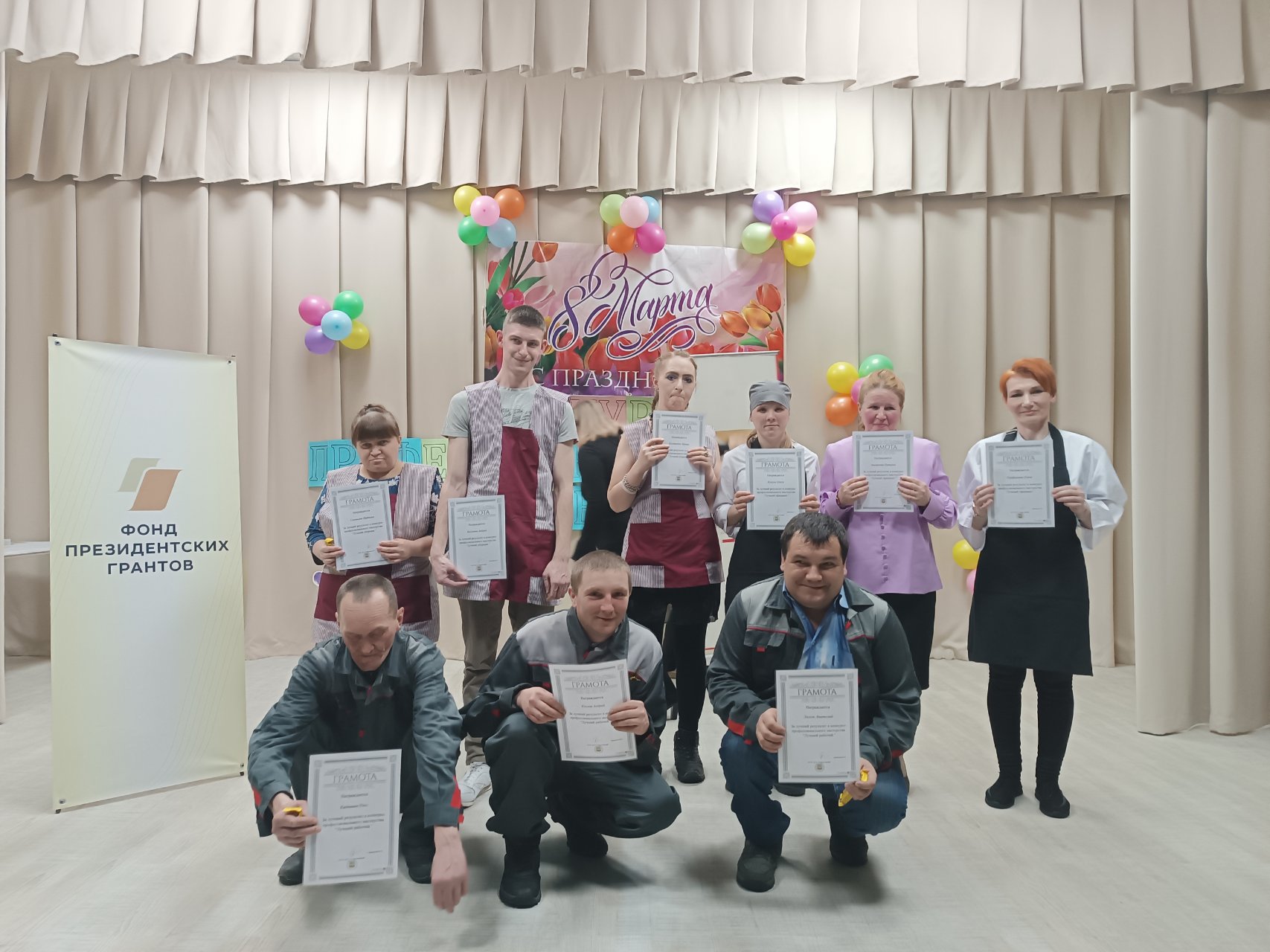 В рамках проекта «Обучение инвалидов ПНИ трудовым навыкам и подготовка к сопровождаемому трудоустройству» накануне праздника 8 марта для участников ЦГ — инвалидов ДСО «Шарыповский» — проведен конкурс профмастерства по специальностям: «Обслуживающий персонал в общепите», «Уборщики помещений», «Разнорабочий». В каждой номинации было по 3 конкурсанта.